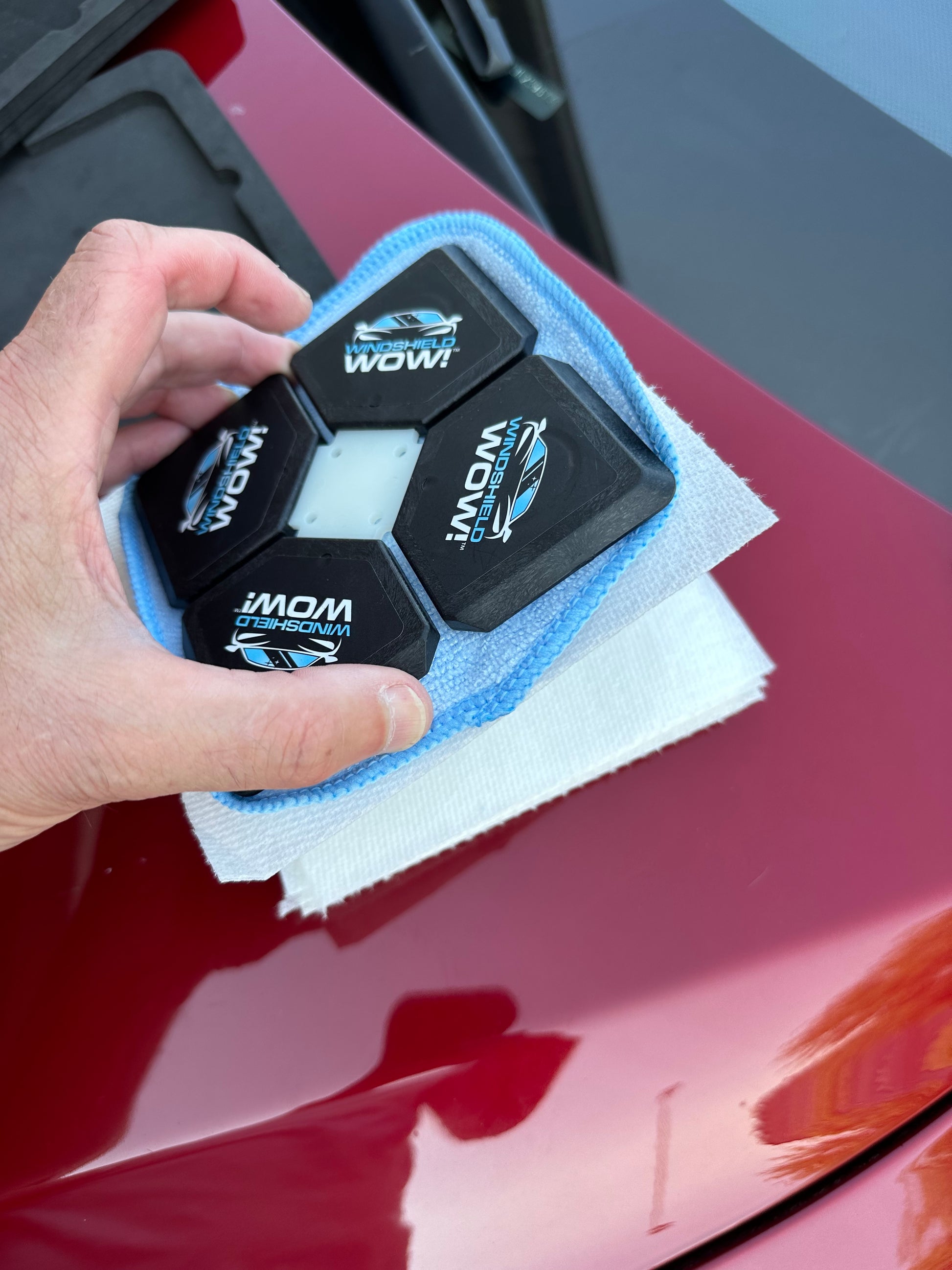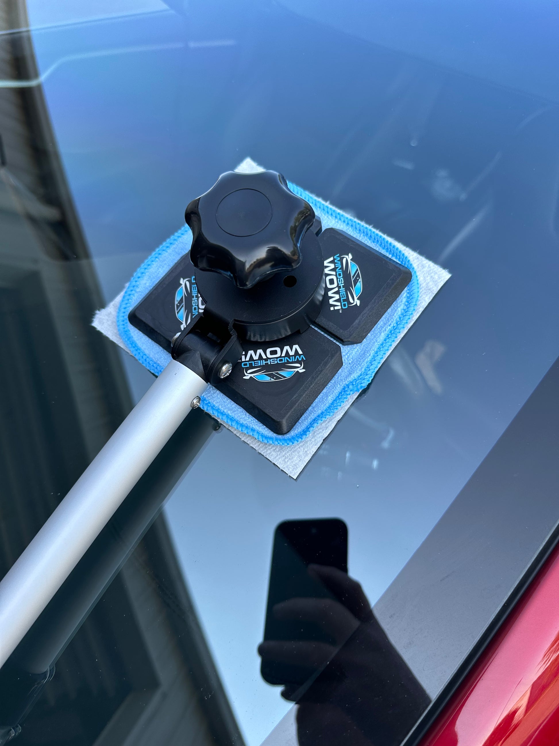 Just attach a microfiber cloth to each of your Windshield WOW! paddles and then attach a dry paper towel to the microfiber cloth. The static will keep it in place! Next, lightly mist both side of your windshield with alcohol (or other liquid cleaner) and finish buff away the streaks and smears left from you wet cleaning. See our Instructions for Use for more details.